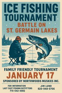 Looking for something fun to do? Come join us for our annual ice fishing tournament on January 17th. Tickets available at Last Cast Fishing Outfitters. Not able to attend but would still like to show support? Raffle tickets are also available to Last Cast Fishing Outfitters.
